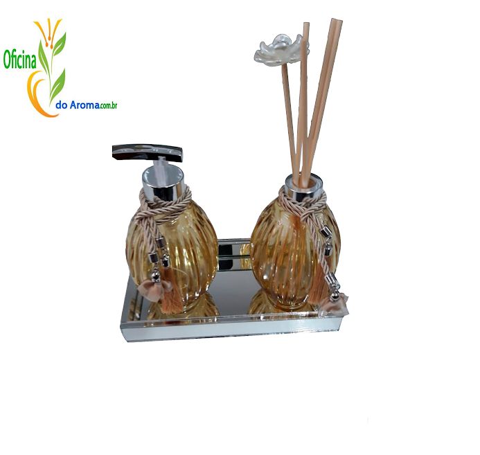 1 Frasco saboneteira 300ml Oval Marron 1 Frasco aromatizador de ambiente com 04 varetas 300ml Oval Marron 1 Bandeija Espelhada
